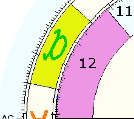 Na poniższym obrazku widać, że przechwyconym znakiem jest Byk w 12 domu. Tutaj 12 dom rozpoczyna się znakiem Barana, natomiast kolejny 1 dom rozpoczyna się znakiem Bliźniąt.